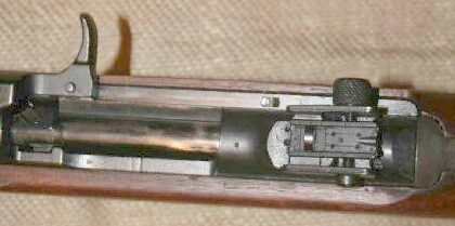 No close up picture of the barrel and it's components could be obtained. The front sight has the side upright tangs removed, leaving only the sight blade. This has been observed on a number of M1 carbines being sold and bought in Germany. Likely it was not done by the Austrian gendarmerie. Barrel band has non-U.S. swivel. The slide does not have the digits of the rifle's serial number.