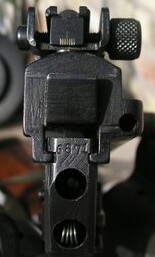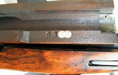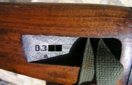 Left side sling well above manufacture mark and underside of handguard have last 4 digits of serial number.