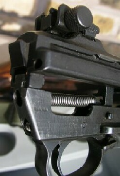 Barrel has flaming bomb ordnance mark just below date of manufacture. Underside of barrel below manufacturer is stamped "INTRAC KNOX, TN". Slide has last 4 numbers of serial number stamped on the outer side of the rail.