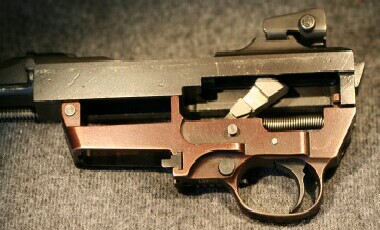 Serial number and manufacturer name obscured by rear sight. Flaming bomb ordnance stamp on receiver top at rear.