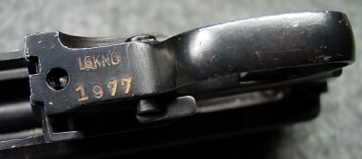 Trigger guard has last 4 digits of serial number on rear "T", bottom of trigger housing forward of trigger guard is stamped LGKNÖ with 1977 underneath the letters. The 1977 is the inventory number assigned by the Austrians.