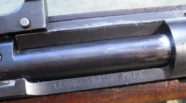 Top of receiver to left of bolt marked Bavaria Forestry Police with markings partially removed.