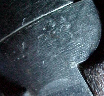 The agency name on the top of the receiver to the left of the bolt has been neatly ground off. On the top of the recoil plate are a series of letters difficult to fully identify. They appear to be "L.K. B.E.C.". The L.K. is clear, the B somewhat clear, the E and C are difficult to confirm, and may be an F and/or G.