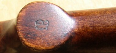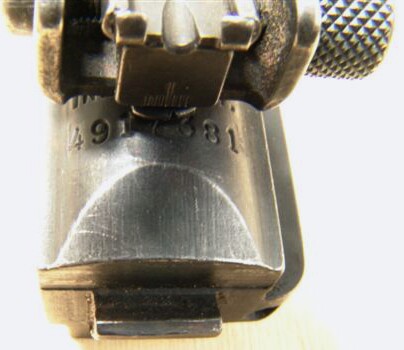 right appears to be a an E or wideways W. Bottom of trigger housing marked WB-LP-2033, meaning Wurttemberg Landespolizei inventory number 2033.
