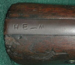 No documentation has been located to confirm the markings assigned to the Justice Police. The HE-J.P. example below would logically fit this agency. The authors of Dienstwaffen der deutschen Polizei und Gendarmerie, Historie, Technk, Kennzeichnung - Hessen (3) have indicated they believe these markings were possibly the Industriepolizei. They indicate the letter J may have been used as no stamp with the letter I was available.