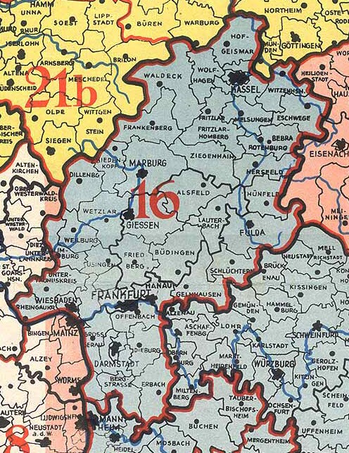Hessen had a post-war population of approximately 4,025,000 within 13,117 sq. miles. An area slightly larger than the State of Maryland. The Office of Military Government, U.S. (OMGUS) subdivided Hessen into three regional districts: Darmstadt, Kassel, and Wiesbaden.