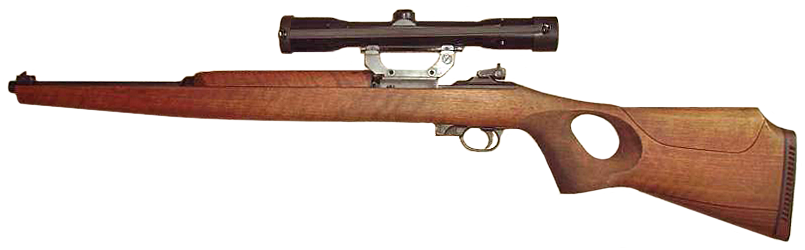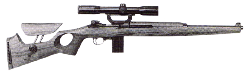 "A custom 7.62 x 33mm (.30) M1 Carbine as used by the Hessian State Police in West Germany. The stock was made by Messrs Wolfe, a noted sporting stock manufacturing company. The scope is a Zeiss-Diavari 1.5 to 6 power variable telescope. About thirty of these special rifles were made" for the Hessian State Police, who used them as sniper rifles.